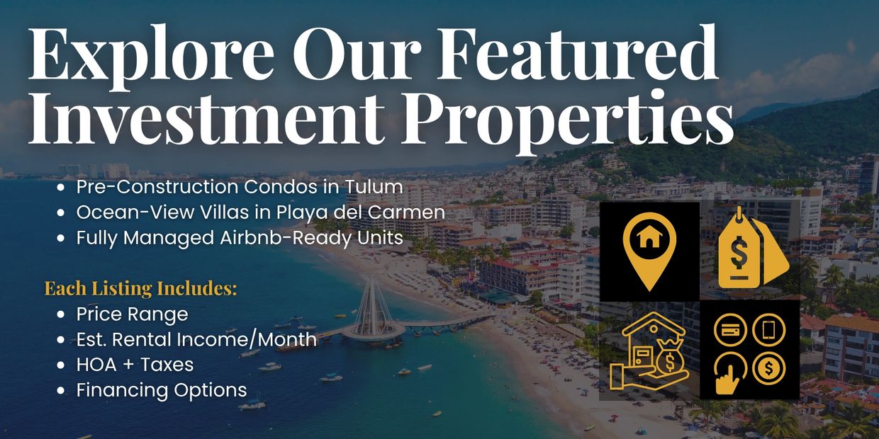 Explore exclusive investment opportunities in Mexico’s hottest destinations — from pre-construction condos in Tulum to ocean-view villas in Playa del Carmen. Each fully managed, Airbnb-ready unit comes with detailed insights including price range, estimated monthly rental income, HOA fees, taxes, and financing options. Whether you're looking for passive income, vacation value, or high-growth potential, these curated listings make it easy to invest with confidence and clarity.